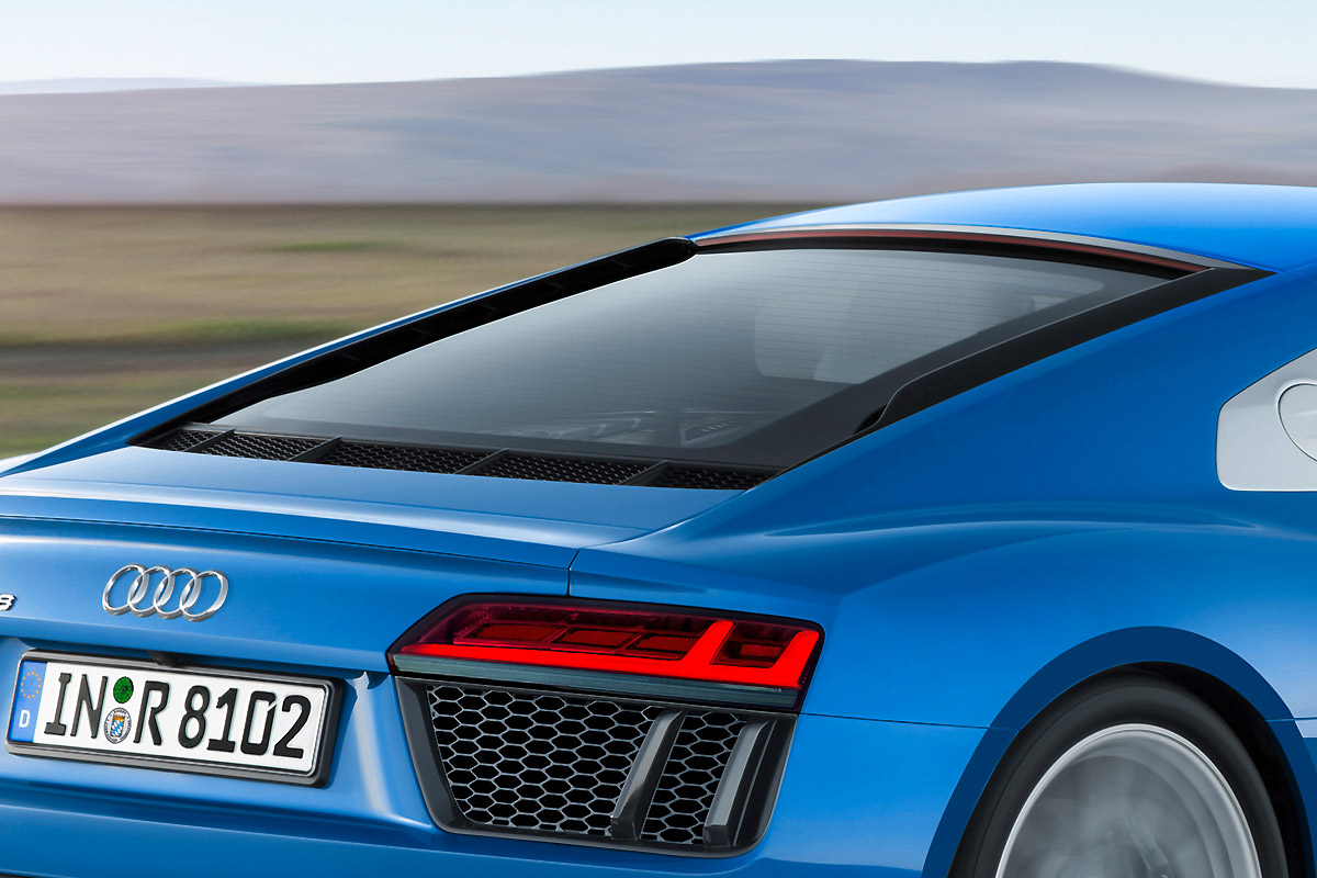 直到正式廠圖的曝光,新一代R8的外型更顯清晰,更趨近於正六邊形的水箱輪廓是主要視覺的焦點,搭配兩旁與前氣壩連成一氣的頭燈,給予R8更為低扁的態勢。從兩旁延伸,深邃的車側進氣孔,讓輪拱線條更為突出。但過去R8上最具特色的車側進氣孔飾蓋卻被一分為二,不再像過去那般,以完整得大面積飾蓋嵌於車側。