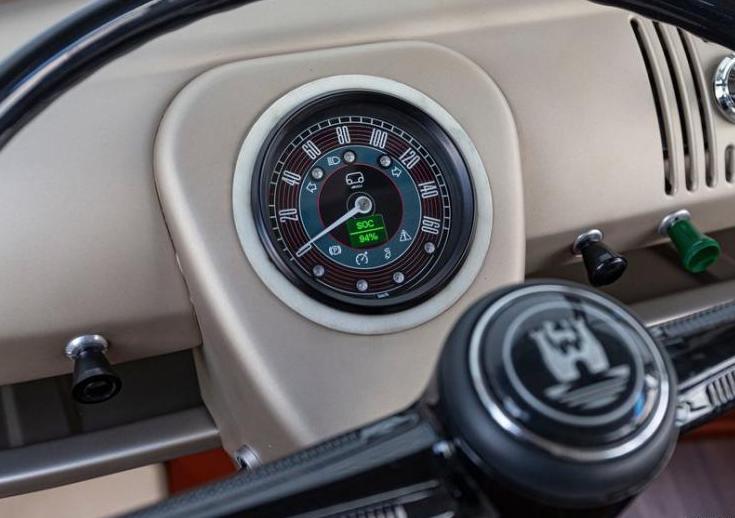 e-BULLI也有一些現代化配置和裝備,在前排中間放置了Volkswagen「DSG」風格的換擋桿,還設有一鍵啓動、駕駛模式選擇、空調等按鍵。在車頂還配備了一個大尺寸顯示屏,可以顯示導航信息,簡直就是復古與現代的完美融合。